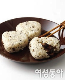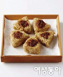 3 밥은 모양을 잡아 뭉친 후 한 면에 손가락으로 눌러 움푹 파고 된장양념을 넣어 삼각 모양으로 만든다.
