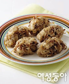 4 밥이 지어지면 섞어 그릇에 담아 한김 식힌 뒤 한입 크기로 뭉쳐서 주먹밥을 만든다.