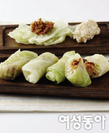 현미 1½컵, 물 1¾컵, 소금 약간, 양배춧잎 10장, 멸치쌈장(멸치 1컵, 다진 양파 2큰술, 불린 표고버섯 1장, 청양고추 1개, 식용유·다진 마늘 ½큰술씩, 물 ¾컵, 된장 3큰술, 고추장 1½큰술, 다진 파 1큰술, 통깨·참기름 1작은술씩)