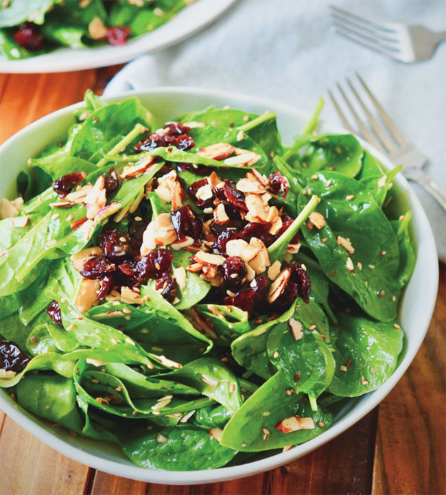 시금치 어린잎 300g, 슬라이스드 구운 아몬드 1컵, 말린 크랜베리 1컵, 참깨 2큰술