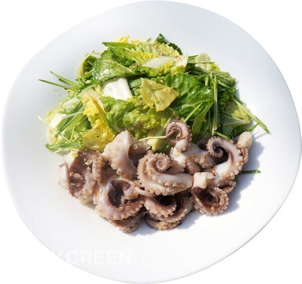 데친 주꾸미 150g(다리만), 봄동 100g (속대만), 보리순 30g ,