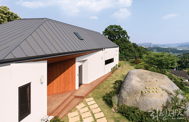 건축주가 대지를 둘러보기 위해 처음 방문했을 때, 이곳은 숲과 바위가 자리 잡은 자연 녹지 지역이었다. 주변으로 펼쳐진 자연 풍광과 특히 커다란 바위가 단단히 뿌리를 내린 모습을 보고 한눈에 내 집 터라는 확신이 들어 주저없이 선택했다. 바위집에 사는 두 자매는 지난해 9월 이곳에 입주하면서 취미인 목공예를 위한 공방과 더불어 매일 여행지에 머무는 듯한 여유로운 일상을 선물받았다. 온전히 자신만의 공간에서 작업에 몰입하거나, 좋아하는 꽃과 야생에서 서식하는 다육식물을 마음껏 키우며 자연 속에 머물고 싶은 자매의 소망을 풍경 속의 집에 오롯이 담아냈다.