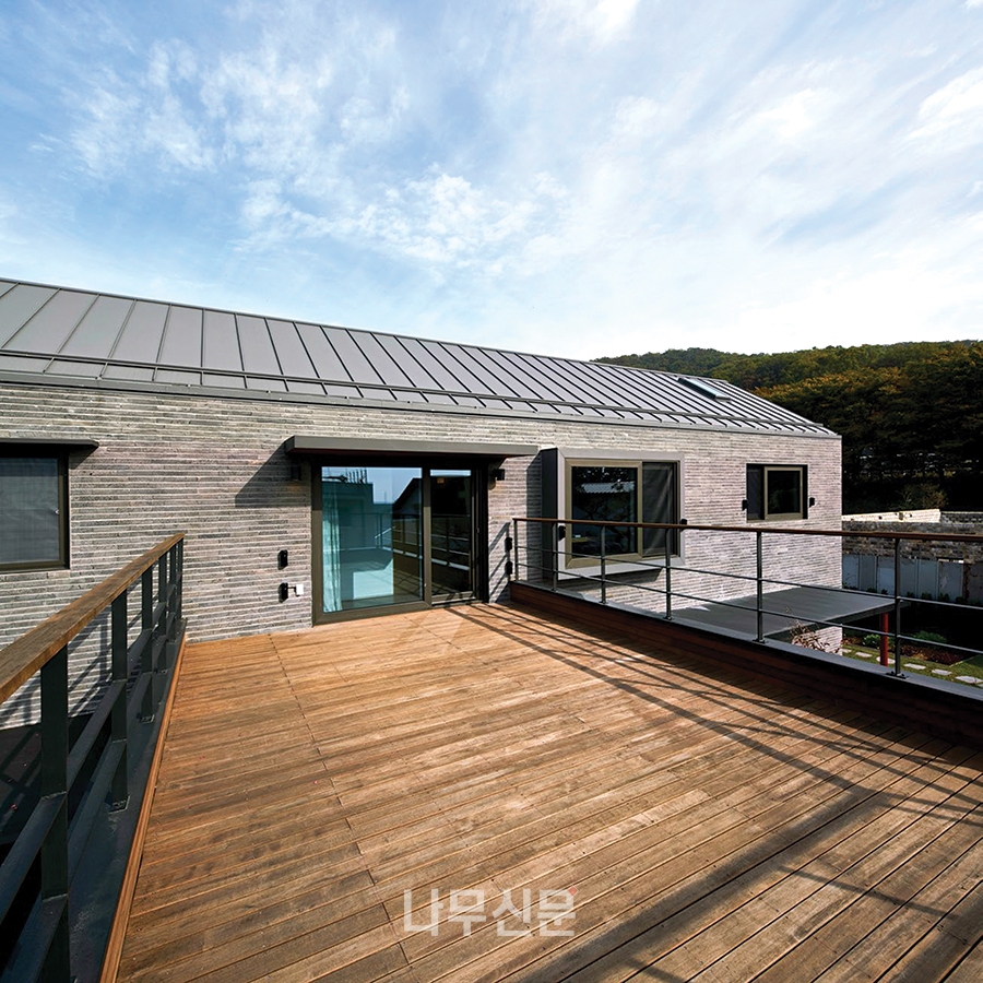 2층에도 넓은 마당이 있다. 1층의 게스트룸 상부를 옥상정원으로 만들어 다양한 꽃과 나무들을 심었다. 습기에 오랫동안 접촉할 경우 수축 등의 변형을 우려해 1차 방수를 하고 스테인리스 스틸로 2중 방수를 했다.