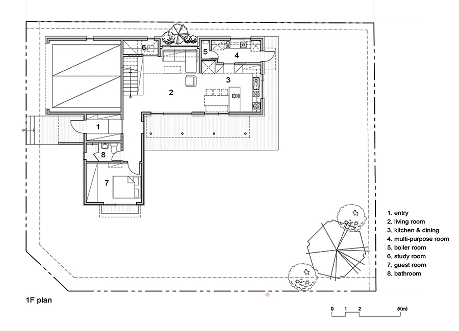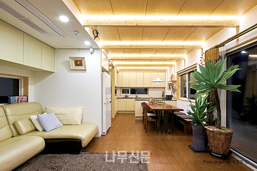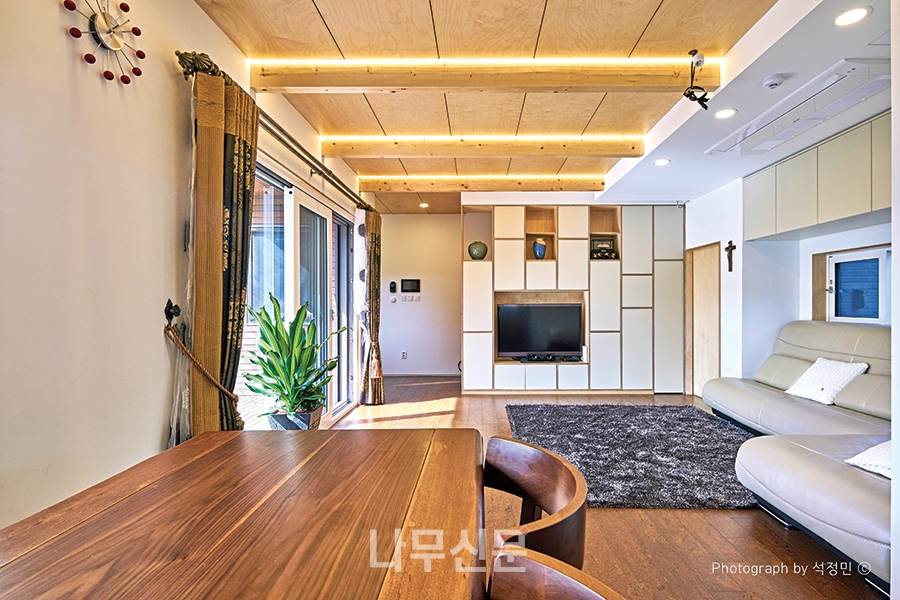 1층 거실과 식당은 내부에 서까래를 노출해 목재의 부드러움이 드러나게 하고 거실 밖 넓은 데크에는 수평의 캐노피가 포치의 역할을 할 수 있도록 1.5m의 폭으로 설치했다.