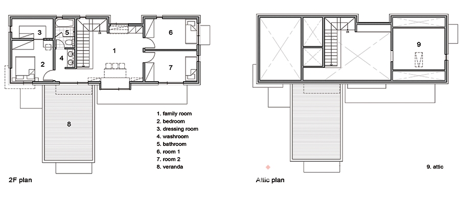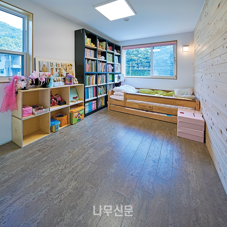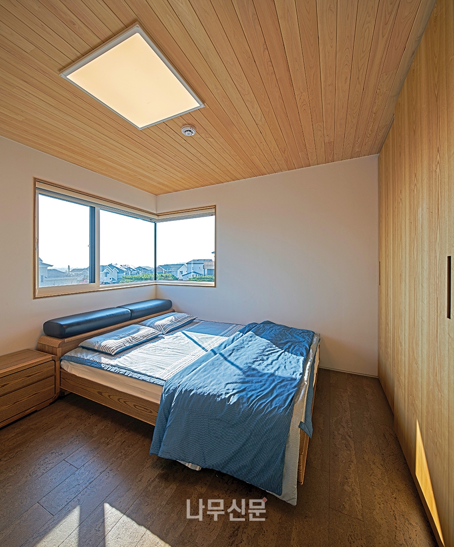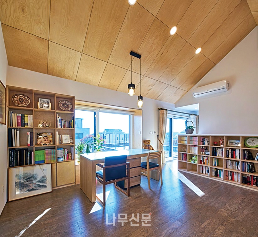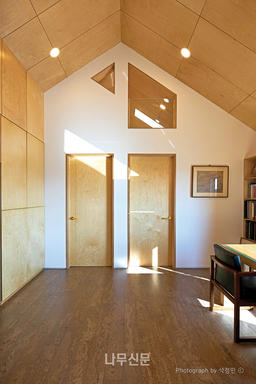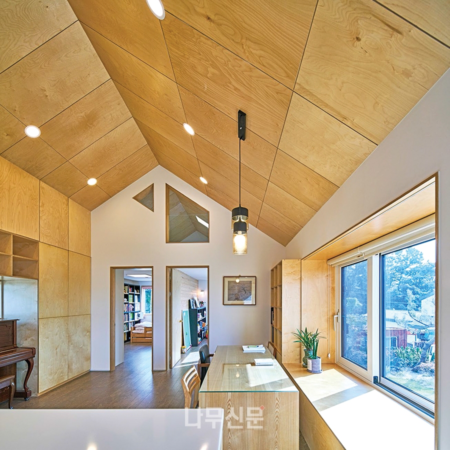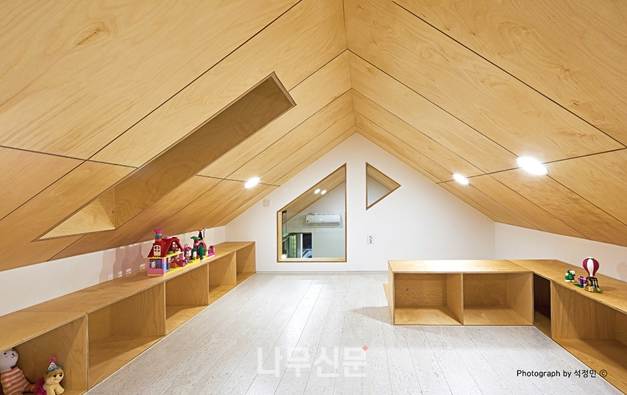 2층에는 아이방 2개를 배치하고 그 위에 조그만 다락을 두어 아이들이 놀이터처럼 오르내릴 수 있게 했다. 박공지붕의 경사가 그대로 노출된 가족실은 아이와 함께 숙제도 하고 책을 읽을 수 있는 책장으로 둘렀다.