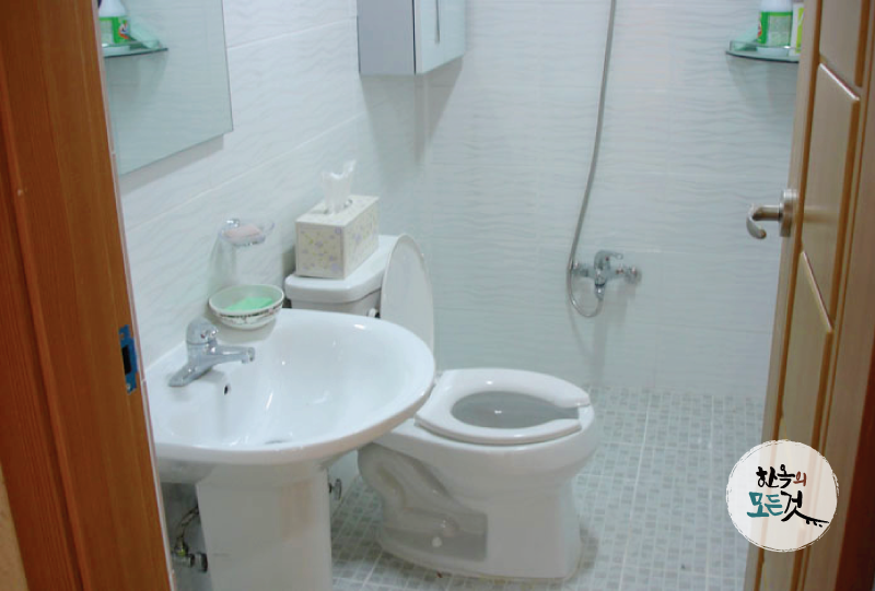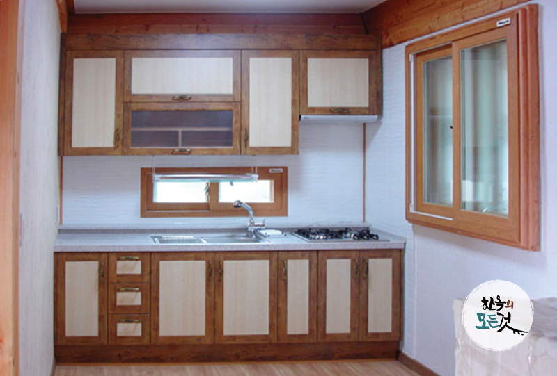 현대식 한옥에서는 하나라도 불편한 공간이 없습니다. 본래의 용도 그대로 편안히 사용할 수 있는 욕실과 부엌입니다. 부엌에서는 대부분 목재를 사용한 가구들로 한옥 분위기를 연출하지만 타일 시공이나 현대식 주방 용품으로 사용하기엔 매우 편리합니다. 또 옆쪽으로 창을 뚫어두어 환기에도 용이합니다. 현대식 화장실은 사용에 불편함이 없도록 신경 쓰여 시공합니다. 전통 인테리어 연출을 위해 목재 수납 장이나 창호틀을 이용하기도 합니다.