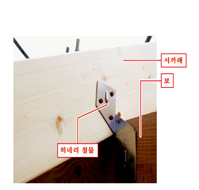 직각으로 만나는 보와 보를 결합하는 연결철물로 보의 측면에 볼트를 연결시켜 구조목간의 결합을 높이고 있습니다.