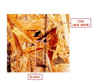우리나라 목조주택에 쓰는 벽체나 바닥용 목재는 주로 칠레나 동남아 등지에서 수입된 것으로 가격은 저렴하지만 화학물질이 많이 포함된 것이 대다수입니다. 건강한 생활을 하기 위해서 목조주택을 지었다 하더라도 포름알데히드나 환경호르몬 같은 화학물질에 노출된다면 건강한 생활과는 멀어지게 되는 겁니다. 저희가 자체적으로 우리나라 목조주택에 사용하는 OSB합판과 중목구조에 쓰이는 일본 합판을 끓는 물에 3분동안 담가, 합판에 본드 같은 화학물질이 얼마나 들어 있는지 확인하는 실험을 해봤습니다.