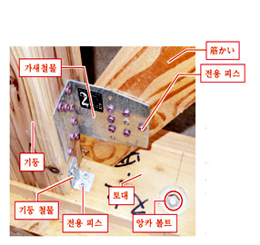 가새와 기둥을 고정하기 위한 연결철물로 가새가 부담하는 횡력을 철물을 경유해 기둥으로 전달하는 역할을 합니다.