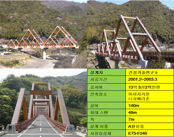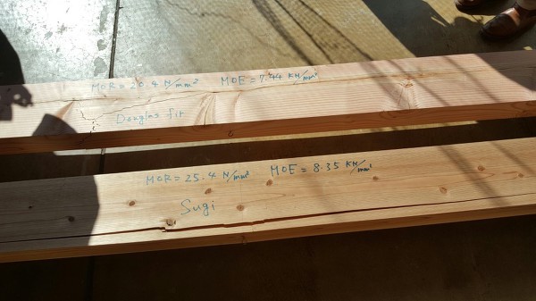 위 실험은 오비스기(미야자키현 삼나무)와 더글라스 퍼(북미산 미송)에 전단하중을 가해 파괴하고 이 하중에 대한 각 목재의 강도를 조사한 것으로 탄성계수(MOE)와 파괴계수(MOR)를 측정한 시험입니다. 탄성계수는 재료에 하중을 가했을 때 외부충격에 저항하는 정도를 나타낸 것으로 탄성계수가 높을 수록 단단한 재료라고 할 수 있으며, 파괴계수는 외부충격에 대한 재료 내부 분자간에 파괴되지 않기 위해 서로 잡아당기는 정도를 나타낸 것으로 물체가 횡하중을 얼마나 지지할 수 있는지를 나타내는 수치입니다. 오비스기의 탄성계수와 파괴계수는 각각 8.35KN/mm2과 25.4N/mm2로 북미산 미송의 7.44KN/mm2과 20.4N/mm2에 비해 월등히 높은 수치를 나타냈으며 이 시험을 통해 삼나무 목재의 전단력과 횡하중에 대한 저항력이 우수하다는 것이 증명됐습니다.