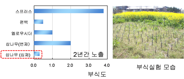미야자키현 목재이용기술센터에서 스프러스(가문비나무), 편백, 옐로우시더(측백나무), 삼나무의 변재부분(나무중심에 있는 수심에서 바깥쪽 부분)과 삼나무의 심재부분(수심과 가까운 부분)을 2년 동안 외부 노출해 얼마나 부식되는지에 관한 실험을 진행했습니다. 2년간 동일한 환경하에 진행된 실험결과 주로 건축용 목재로 사용되는 삼나무 심재부분의 경우 부식이 거의 발생하지 않았고, 내부 장식용으로 사용되는 변재부분도 일반 경량목구조의 각재로 주로 사용하는 스프러스에 비해 월등히 뛰어난 방부성능이 확인됐습니다.