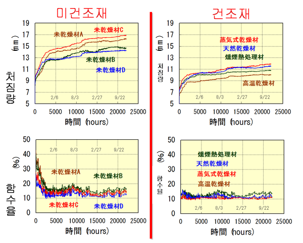미건조 목재와 건조 목재의 처짐량과 함수율을 시간단위로 측정해 보면 함수율이 높은 미건조재의 처짐량이 건조재에 비해 심각하다는 것을 확인할 수 있습니다. 즉 수분을 덜 함유하고 있는 건조재의 치수안정성이 더 낫다는 것을 의미하는데요. 저희가 공급받고 있는 일본의 제재소는 미야자키현 목재이용기술센터와 연계해 구조적 안정성과 단열, 그리고 치수안정성을 고려해 제재한 목재를 최적의 함수율에 맞춰 건조시키고 있습니다.