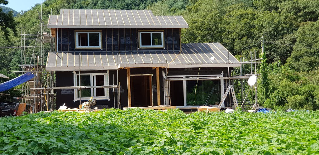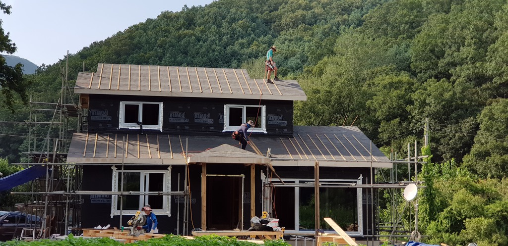 2층의 전면부와 우측 지붕위의 벽은 세라믹 사이딩 시공예정이므로