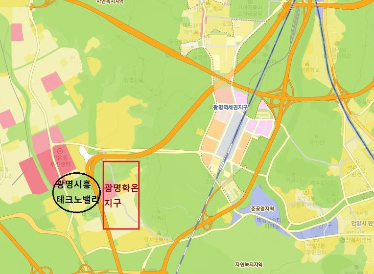 위 지도를 보면 광명학온지구, 광명시흥테크노밸리에 거주하거나 근무하는 사람들은 광명역을 이용할 것인데요.