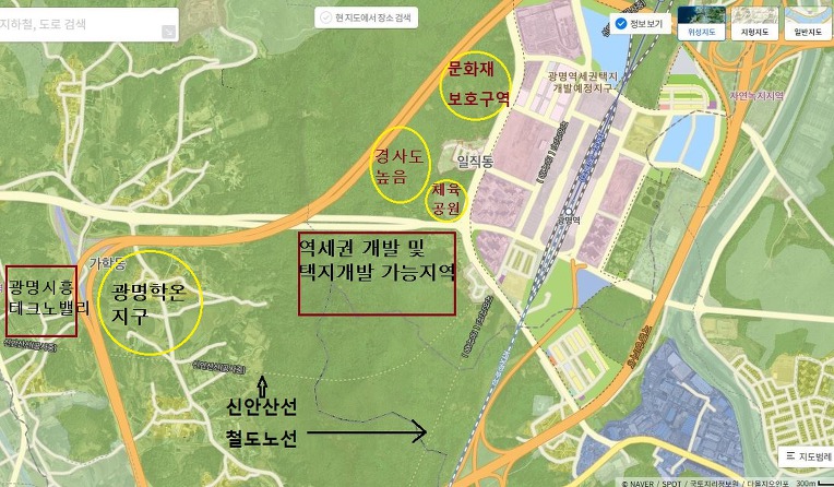 광명역에서 가깝고 경사도도 낮아야 개발하기 좋겠죠?