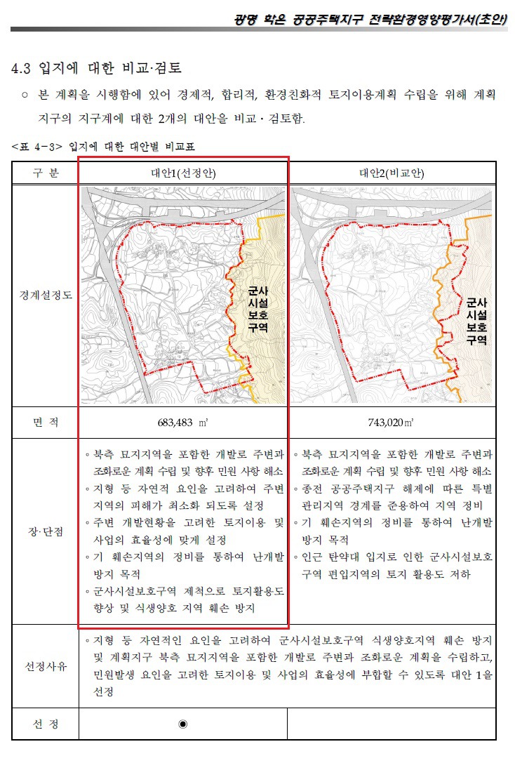 2개의 안을 비교, 검토한 결과 주변 개발현황을 고려한 토지이용 및 사업의 효율성을