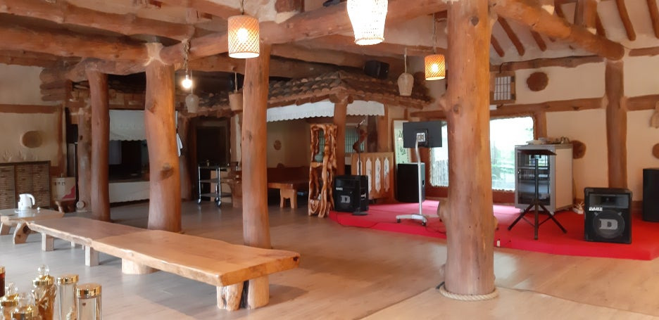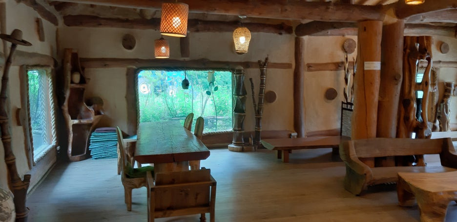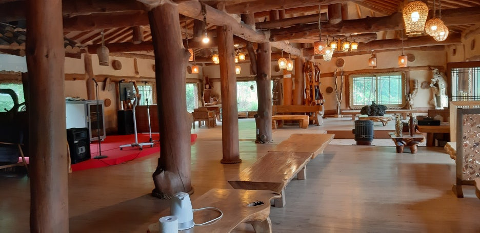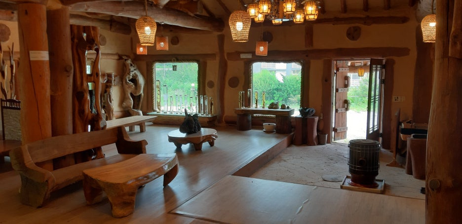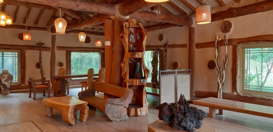 통나무 기둥과 서까래, 흙벽과 흙천정이 나무탁자와 나무 조각품들이 어우러져