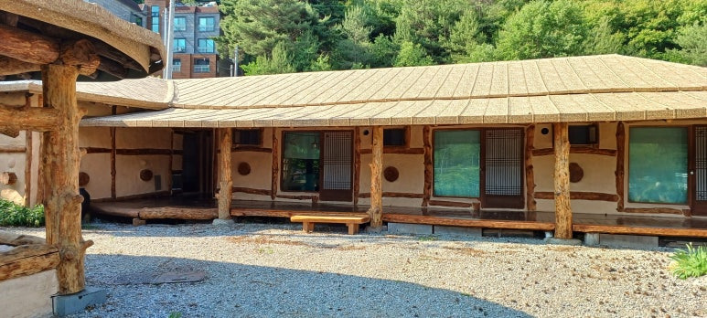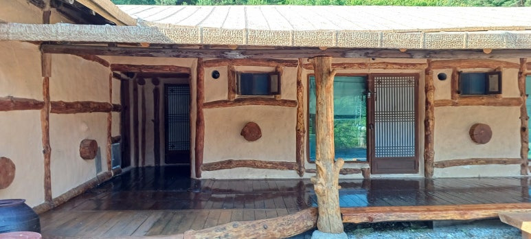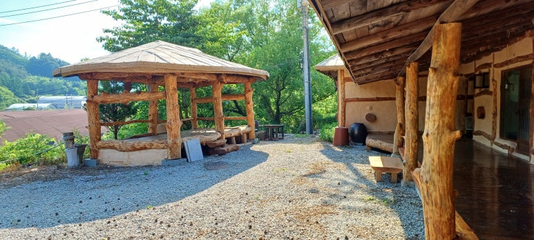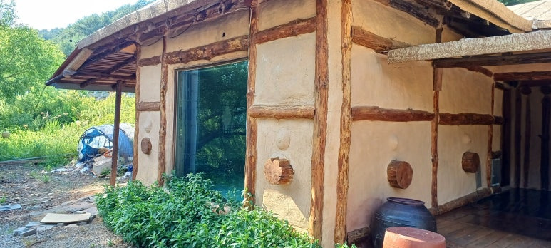 통나무 골조에 황토흙과 황토 벽돌을 사용한 친환경 건물입니다