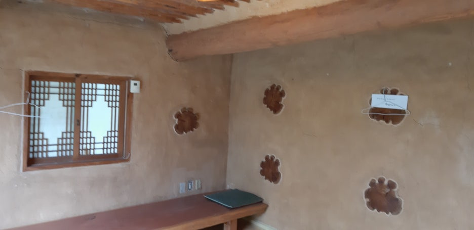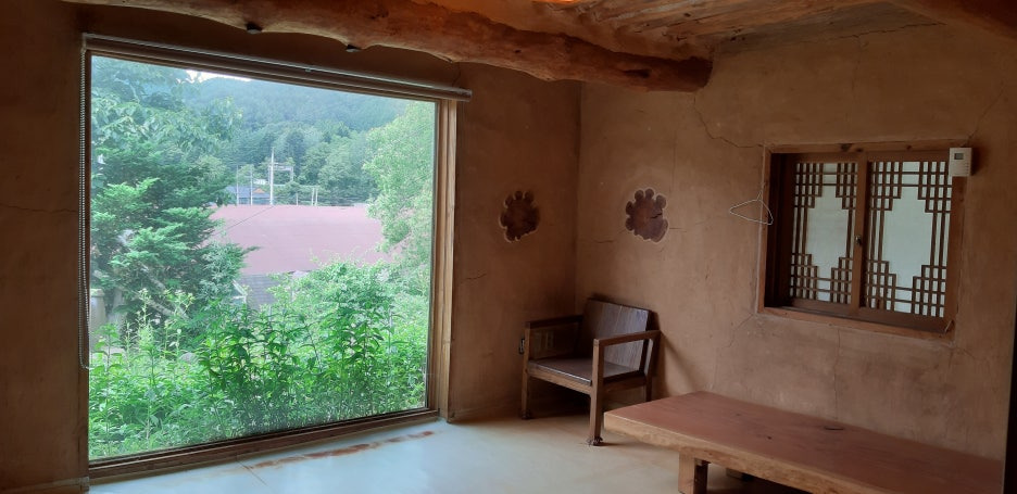 정남향 부지에 굵직굴직한 통나무와 약 40-50cm 황토벽 두께로 단열이 잘 되어