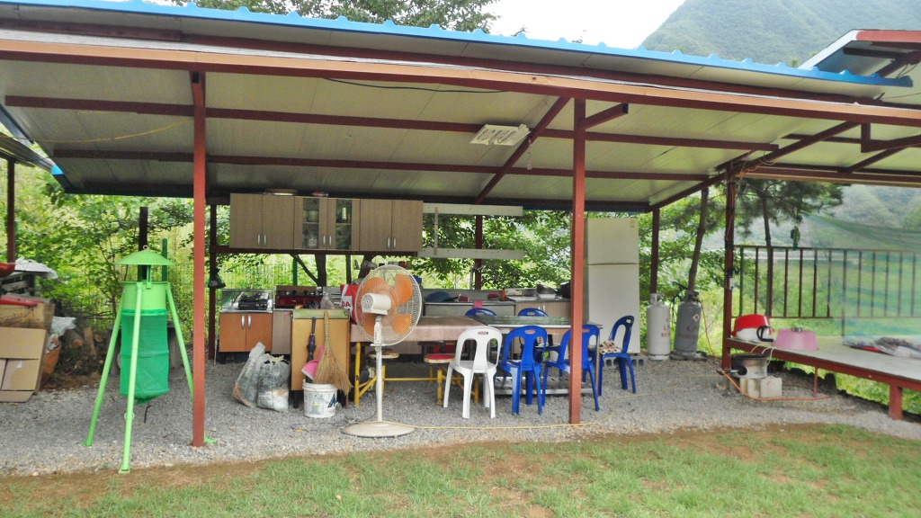 주택앞에 그늘막 주방시설...