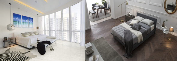 밝은 분위기를 내는 화이트 컬러 마루로 마감한 방(왼쪽), 브라운 계열 마루로 기품있게 연출한 방.