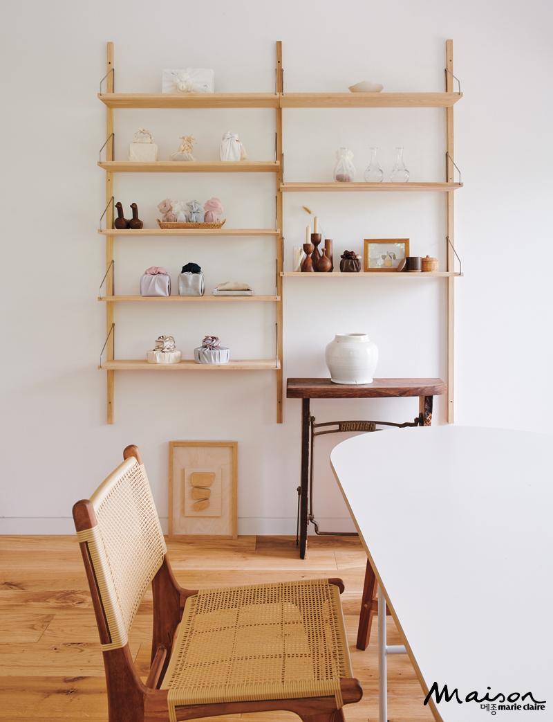 바닥과 가구, 소품까지 원목으로 통일했다. 공방의 한쪽 벽면을 채우고 있는 원목 선반은 남편이 직접 만들었다. 그 위에 부부가 결혼 전부터 모은 소품을 진열했다.