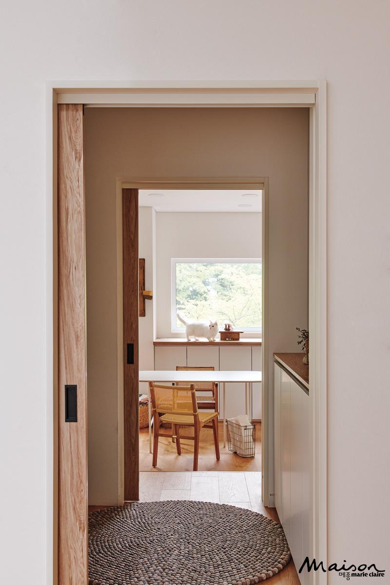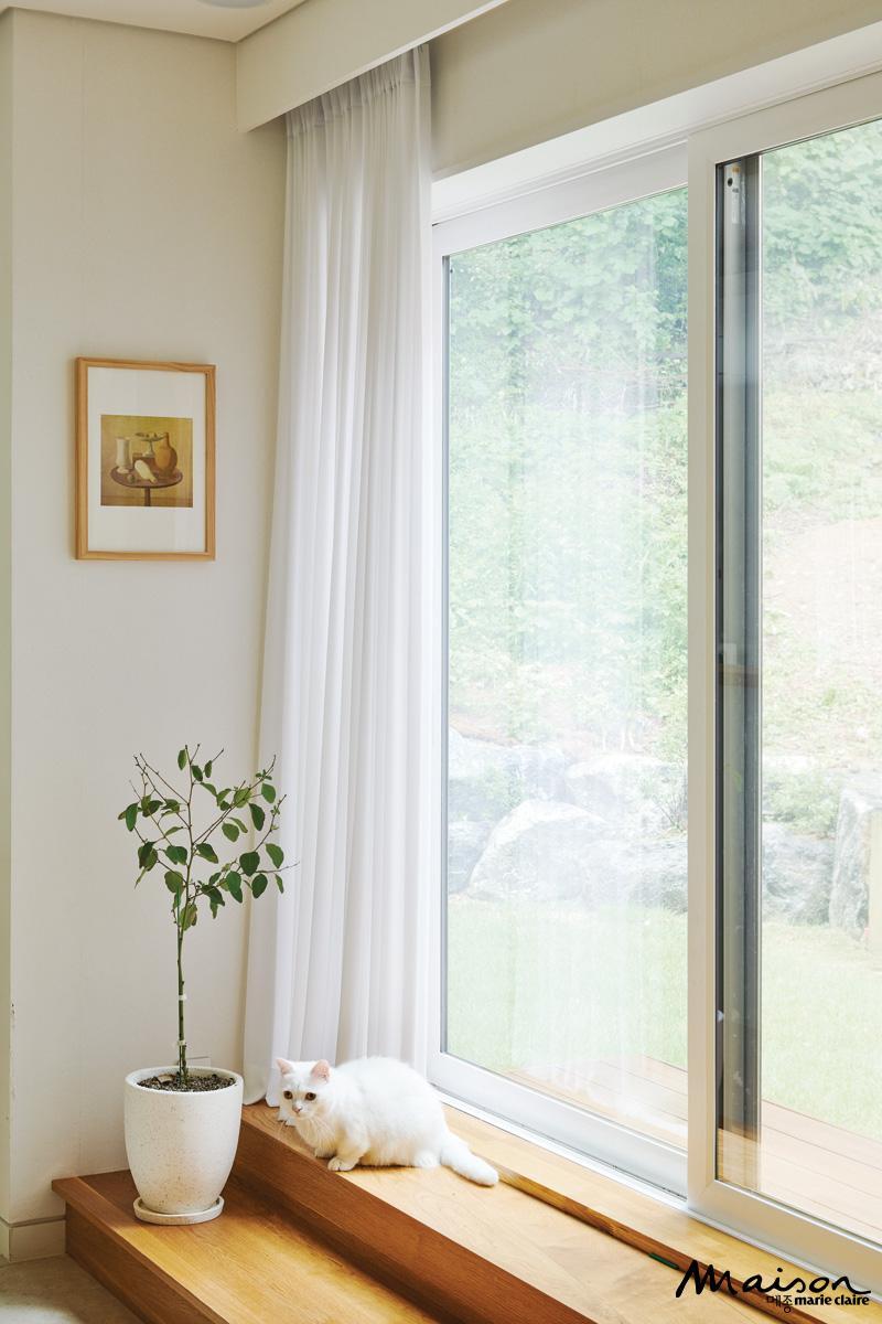 현관의 왼쪽에 자리한 아내의 공방. 한복 디자이너 겸 보자기 작업을 하는 아내를 위해 남편이 심혈을 기울여 공간을 마련했다. 창가에 있는 고양이 구름이와 창을 통해 보이는 바깥 풍경이 한 폭의 그림 같다.