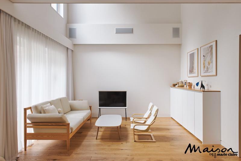 아이용 의자와 소파가 마주 보고 있는 아늑한 거실. 음악을 즐겨 듣는 부부는 거실 벽면 상단에 스피커를 매립했다.