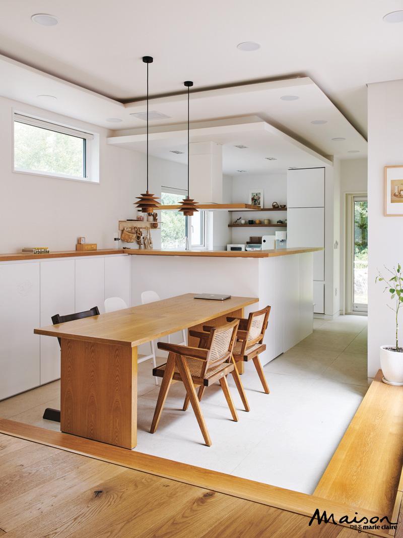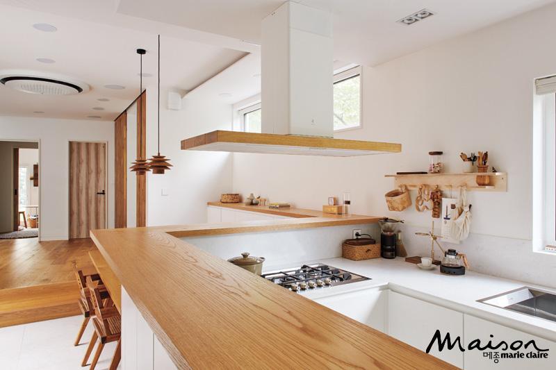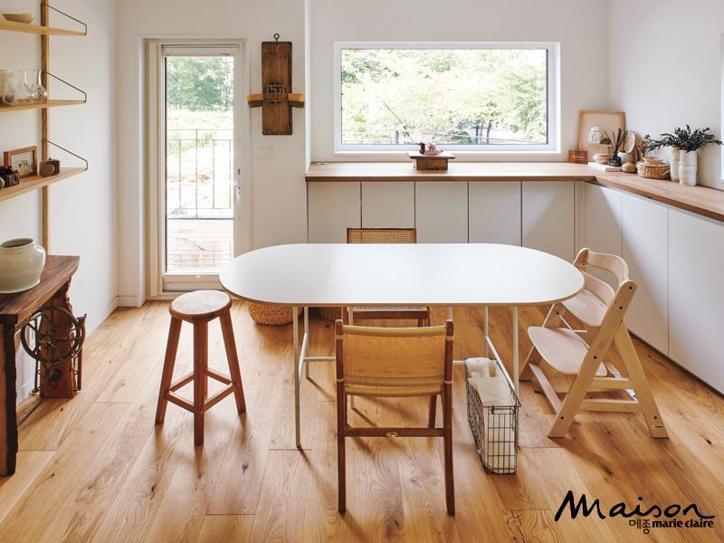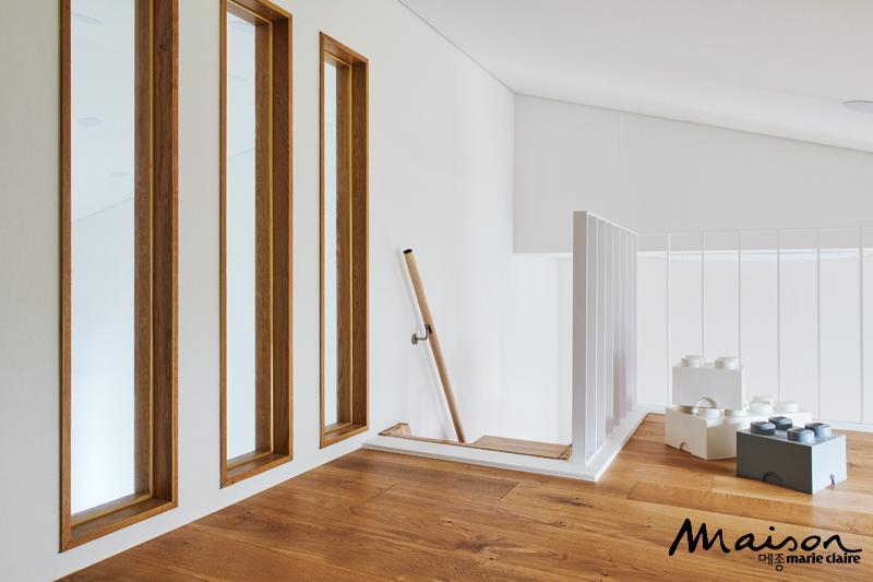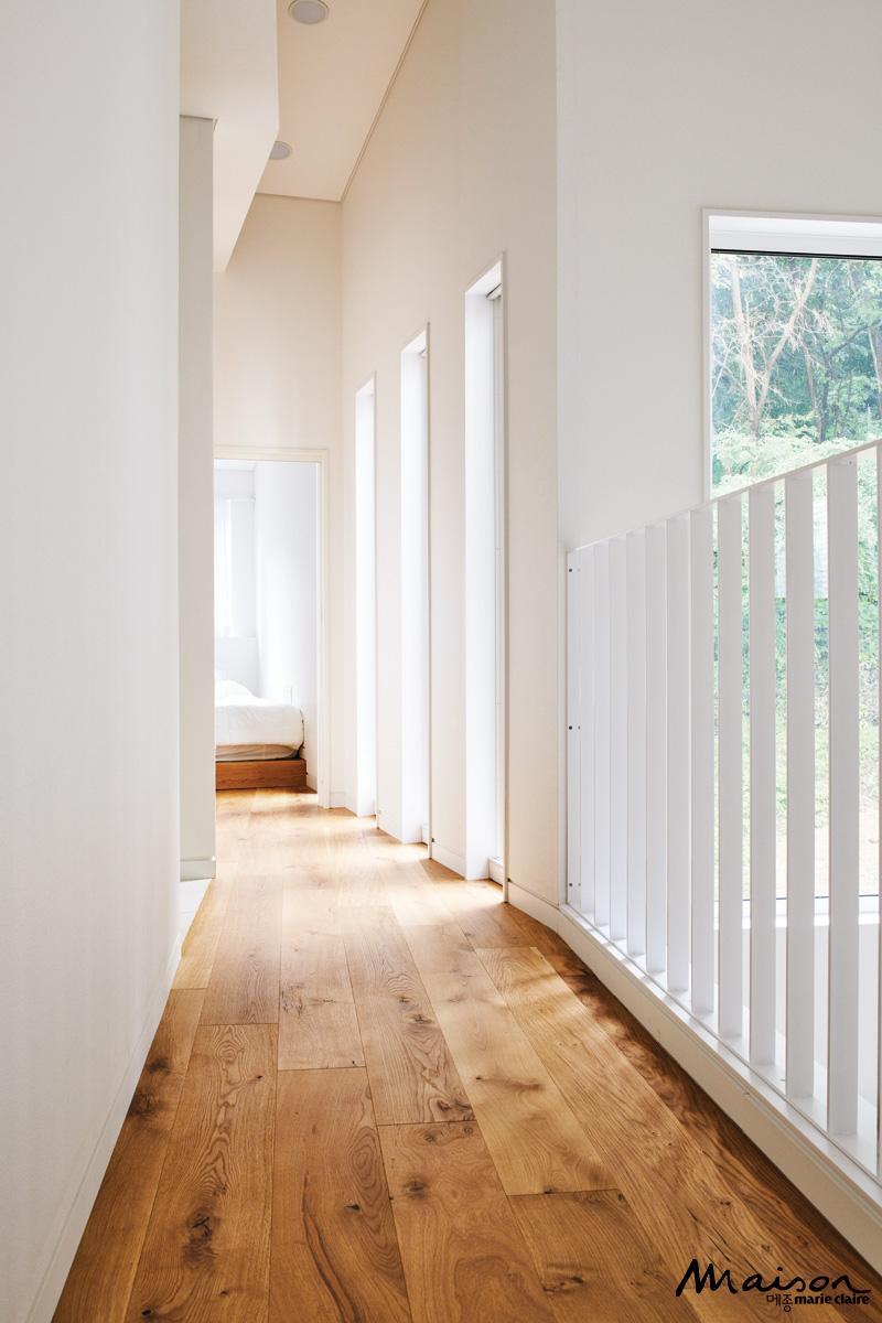 이 집이 더욱 특별한 이유는 남편과 아내가 직접 설계부터 실내 인테리어 시공까지 도맡아 진행했기 때문. 문득 인테리어 업계에 종사하는 건 아닌지 궁금했다. “전혀 아니에요. 남편은 평범한 회사원이에요. 공대 출신인데 워낙 만드는 것을 좋아해서 평소에도 작은 가구들은 뚝딱뚝딱 만들곤 했어요. 이곳은 3년 전에 계약해두었던 땅이죠.작년부터 공사를 시작해 올해 6월에 입주했으니까 대략 5~6개월이 걸렸네요. 저희가 원하는 주택을 몇 가지 구상하고 주말마다 올라와서 공부를 하고 수정도 하며 완성했어요. 물론 전문적인 부분은 공사를 담당한 실장님의 힘을 빌렸고요.” 아내가 설명했다. 지하 차고와 마당, 지상 2층 구조의 이 집은 총면적까지 더하면 231㎡이지만 내부의 실평수는 165㎡ 남짓이다. 마루와 창틀, 계단, 문, 가구부터 작은 소품에 이르기까지 원목으로 통일해 창밖으로 보이는 자연경관과 썩 잘 어우러지며, 큰 창을 통해 들어오는 충분한 채광도 이 집을 더욱 특별하게 만드는 데 한몫했다. 현관을 기점으로 왼쪽으로는 한복 디자이너 겸 보자기 작업을 하는 아내를 위한 공방을 만들었고, 답답한 것을 싫어하는 부부는 소리가 울릴 만큼 천고를 최대한 높게 시공했다.