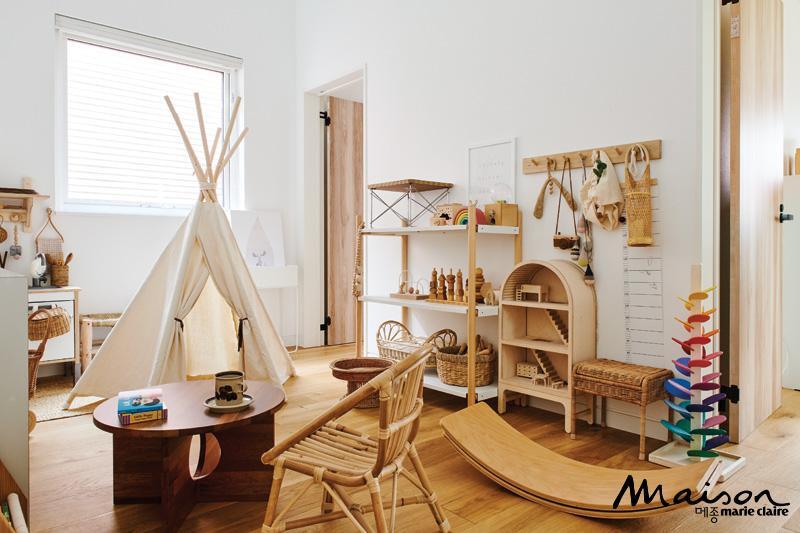 세 남매를 위한 놀이 공간. 작고 아늑한 공간을 좋아하는 아이들을 위해 인디언 텐트와 다양한 원목 장난감으로 꾸몄다.