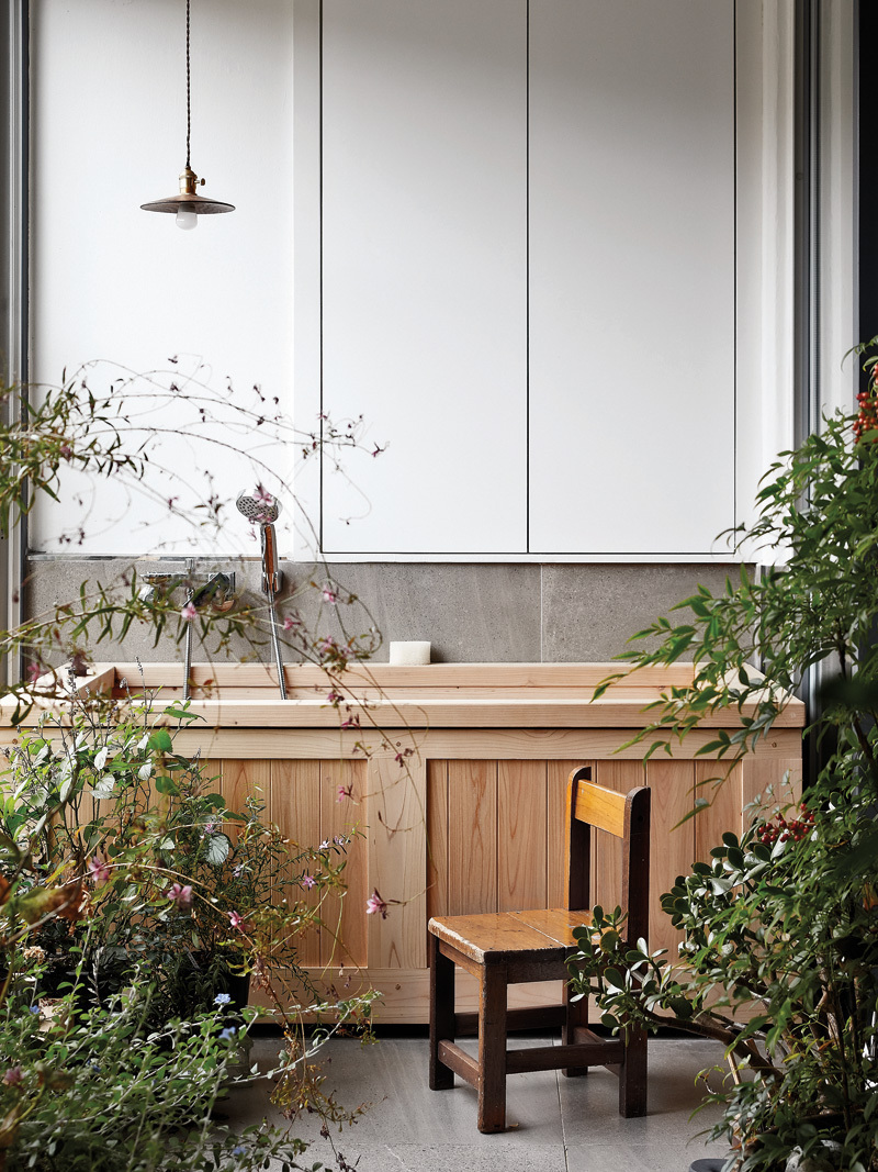 베란다에 휴양지 같은 욕실이 생겼다. 야외에서 반신욕을 하는 기분을 낼 수 있는 방법을 고민하던 집주인은 베란다 한 켠에 히노키 욕조를 두었다. 베란다에는 이미 수도 시설이 갖춰져 있고, 반신욕만 하는 욕조이기 때문에 공간을 크게 차지하지 않았다. 사생활 보호가 우려되지만 아파트 앞이 사람들의 발길이 닿지 않는 산이어서 설치가 가능했다. 욕조 주변을 식물들로 풍성하게 꾸미고, 베란다 창문을 통해 산을 바라보며 반신욕을 즐길 수 있는 보물 같은 공간이 탄생했다.