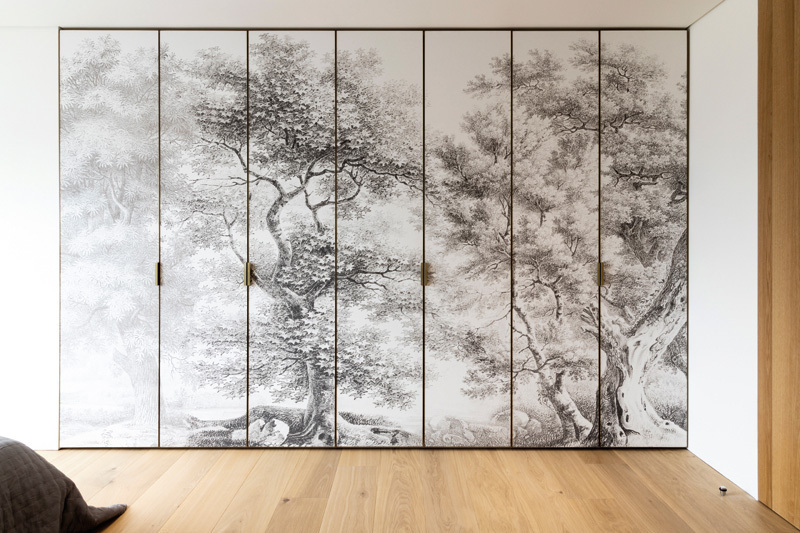 HJRK 김혜진 대표는 보다 확실한 개성이나 취향을 느끼고 싶다면 옷장이나 붙박이장의 마감을 색다르게 해볼 것을 제안했다. “마치 창가에서 바깥 풍경을 바라보거나 흑백 산수화를 보는 것처럼 동양적이고 차분한 분위기를 느낄 수 있는 옷장이에요. 표면에 그림을 그린 것이 아니라 아주 섬세한 작업을 통해 옷장에 벽지를 붙였어요. 단독주택이 아니라도 그런 기분을 낼 수 있어 일석이조랍니다”라며 수납장 아이디어를 소개했다. 문을 열기 전까지는 가구처럼 보이지 않는다는 게 이 붙박이장의 매력이다.