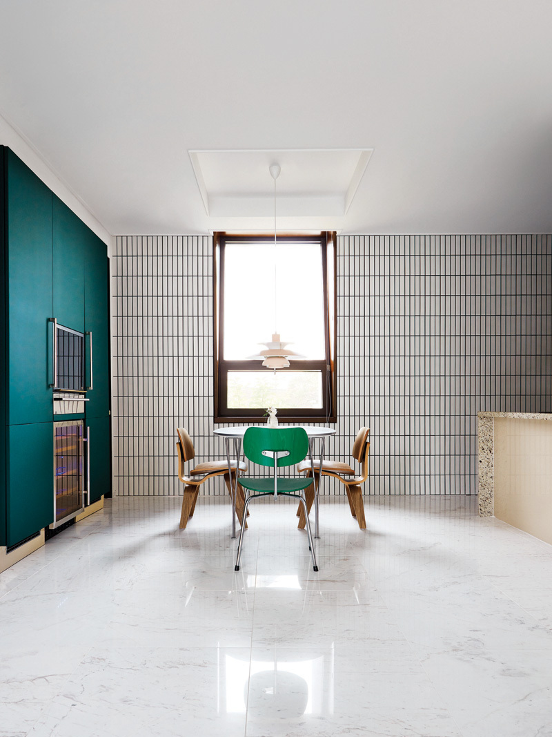영상과 그래픽을 전공한 디자이너의 감각을 엿볼 수 있는 다이닝 공간은 벽면 전체를 타일로 시공한 점이 특징이다. 멀리서 보면 블랙&화이트 무늬처럼 보이는 벽면은 타일을 일일이 시공한 것으로, 바닥에 시공한 대리석 타일과도 잘 어울린다. 보통 타일은 바닥이나 주방의 일부, 욕실, 현관 등에 포인트로 시공하는데, 부부는 벽면 전체를 과감하게 타일로 시공했다. 대신 주방 가구와 조명, 의자에 색상으로 포인트를 줘 색다른 다이닝 공간을 완성했다.