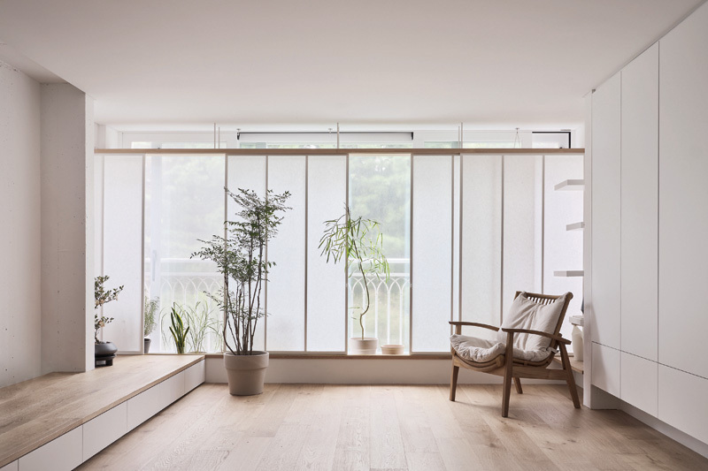아파트이지만 단독주택처럼 느껴지는 거실을 꿈꾼다면 이 사례를 참고해보자. 아뜰리에페이퍼 한철수 소장은 천편일률적인 아파트의 평면에 변화를 줬다. 그의 아이디어는 거실에서 더욱 빛을 발하는데, 거실 창문 안쪽에 문을 하나 더 만든 것. 흰색 철제 프레임을 만들고, PVC 창호지를 붙여 마감한 문 덕분에 바깥의 외벽 난간도 자연스럽게 가리면서 햇빛이 은은하게 들어와 전형적인 아파트 거실 디자인에서 벗어날 수 있었다. 또 일반적인 소파와 TV, AV장 대신 단차를 높인 평상을 만들어 언제나 편안하게 앉을 수 있도록 했다. 이런 거실이라면 아파트에서 살고 있다는 사실을 잠시 잊게 될 것 같다.
