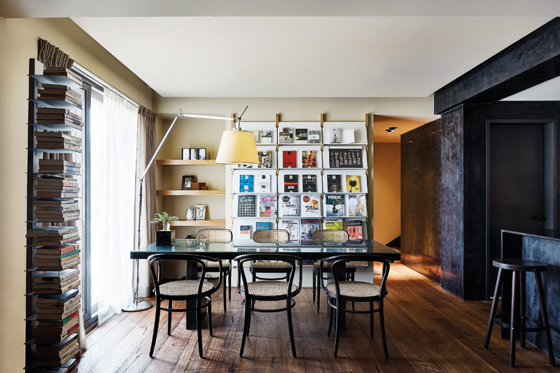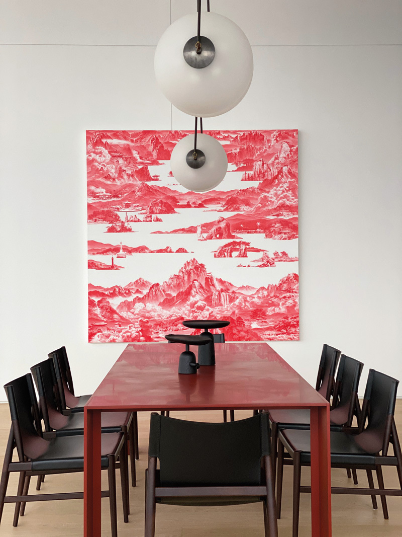 한번 구입하면 오랫동안 사용하게 되는 식탁은 원목이나 대리석 소재를, 색상은 흰색, 회색, 베이지색 등 무난한 제품을 선택하는 경우가 많다. HJRK의 김혜진 대표는 다이닝룸의 사례를 소개하며 “이세현 작가의 붉은 산수화를 벽에 건 다이닝룸에 비슷한 색상의 식탁을 매치했어요. 보통 벽에 거는 작품의 색상이 강할 경우 주변 가구는 덜 튀는 색상으로 선택하기도 하지만, 식탁 역시 강렬한 색상을 골랐어요. 대신 의자나 조명을 간결한 디자인과 색상으로 고르면 부담스럽지 않은 공간을 연출할 수 있어요”라고 조언했다. 거실의 중심 가구가 소파이듯 많은 시간을 보내는 식탁 역시 다이닝룸의 주인공이라 생각하고 과감한 색상에 도전해볼 것.