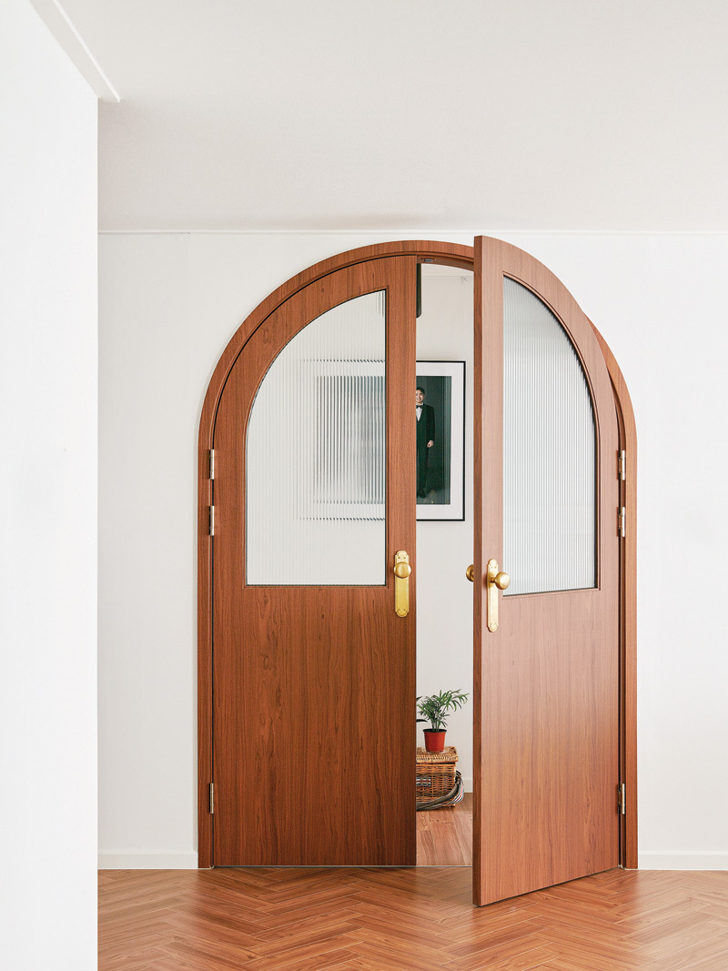 공간도 가구도 심플한 스타일이라 자칫 차가워 보일 수 있다면 아치형 중문으로 포인트를 주자. 보통 현관에 설치하는 중문을 침실 입구에 설치하면 주변 스타일을 환기하는 역할을 톡톡히 해낸다. 금색 손잡이와 골진 모루 유리를 끼운 문은 공간을 분리하는 동시에 답답한 느낌을 없애기도 하니 일석이조의 효과를 누릴 수 있다.