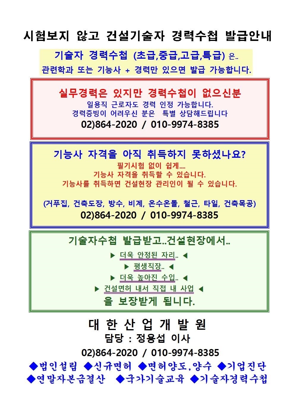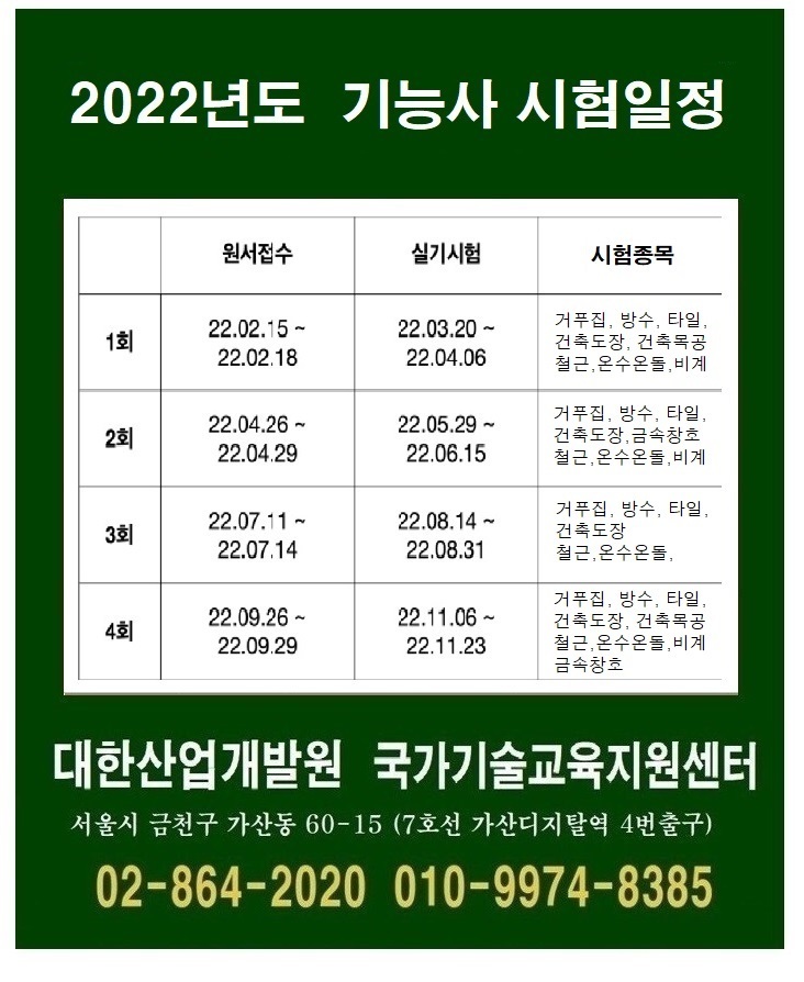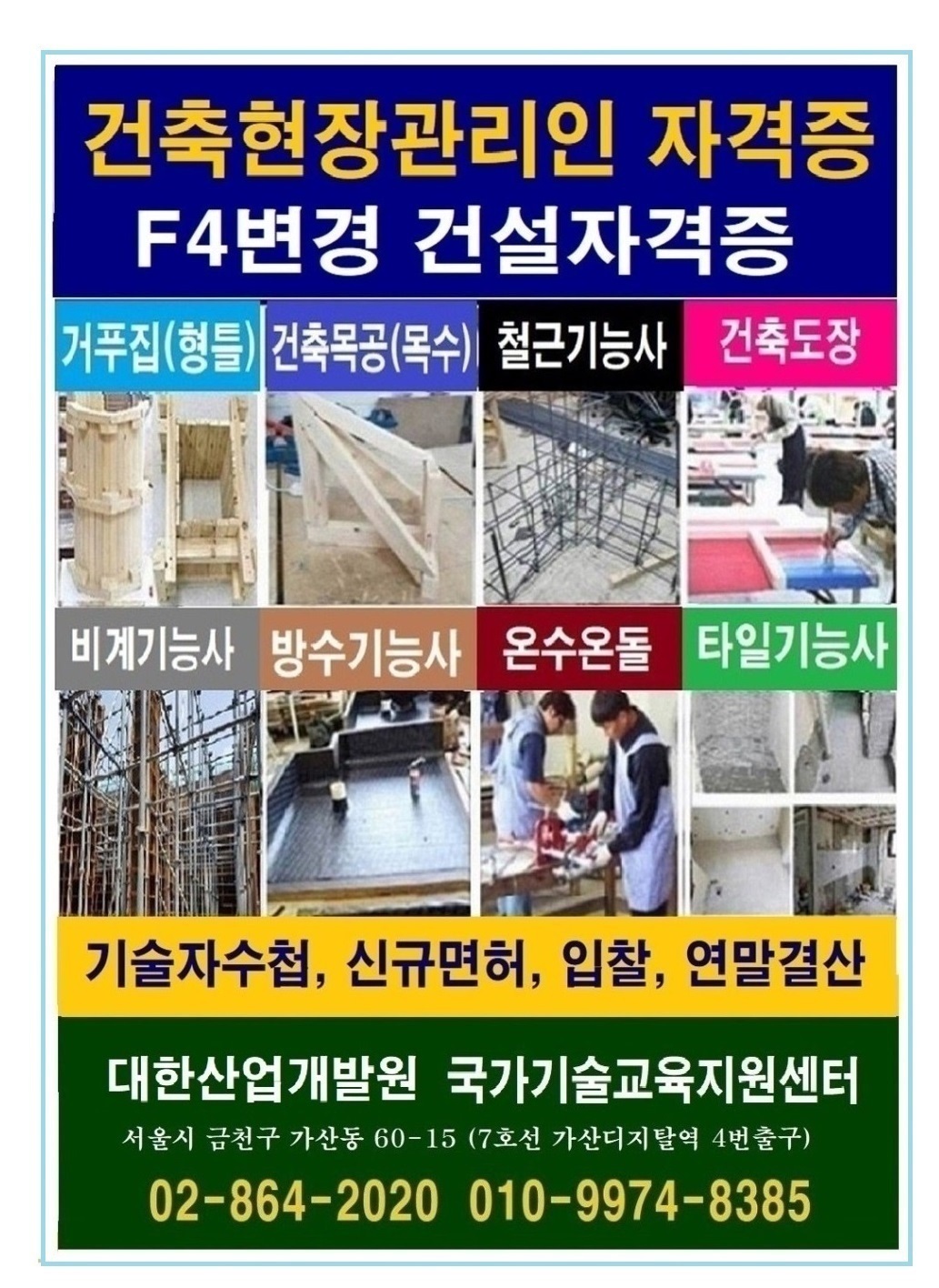 철근기능사 자격증 시험 (제2회 5월시험) 지금부터 준비합시다. 현장관리인 자격증으로 많이 취득하고 있는 철근기능사 60평이하 소규모 건축업을 하시는 사업자나 건축주는 반드시 현장관리인을 배치해야 하는데 쉽게 취득 할 수있는 자격증 중에 철근기능사가 있습니다. 그리고 f4비자변경을 하기 위해서는 필기시험이 없는 자격증에는 쉽게 취득 할 수 있는 건설현장자격증으로 많이 취득하고 있는데 그중에 철근기능사를 많이 취득 하고 있습니다. 철근기능사는 필기시험이 없이 실기시험으로만 치르고 시험시간은 3시간 30분 주어지며, 주어진 도면을 보고 절단, 배근작업으로 완성을 하는 것입니다. 철근기능사는 2021년에는 3회 시험이 있는데 시험일정을 잘 보시고 접수일이 임박하기 전에 미리 학원에 교육 등록을 해 주시면 원서접수와 교육을 학원에서 챙겨서 해드립니다. 철근기능사는 건축물 중에 중요한 부분인 철근 콘크리트를 하기 위한 기초가 되는 작업으로 기둥, 보, 바닥판 옹벽등이나 콘크리트조를 보강하기 위해 기둥, 보, 바닥, 벽등 철근배근작업을 하는 업무입니다. 건축물의 안전을 위해서는 건축물이 골조부터 튼튼하게 해야 되는데 가장 기초가 되는 철근콘크리트공사로 완벽하게 건축물을 시공하기 위해서는 철근공사가 아주 중요합니다. 그래서 철근공사에 전문 기능인이 필요하기 때문에 철근기능사는 건설현장에 유용한 자격증이라고 볼 수 있습니다. 대한산업개발원에서는 전문강사를 통한 체계적으로 시험출제와 동일한 반복적인 학습으로 건설 초보자도 쉽게 취득 할 수 있도록 교육을 진행 하고 있습니다. 철근기능사 자격증 F4건설현장자격증,건축현장관리인 ,철근자격증을 건설전문학원에서 취득합시다. 필기시험없이 쉽게 취득 할 수 있는 건설현장자격증에는 철근기능사, 방수기능사, 건축목공기능사, 거푸집기능사, 타일기능사, 조적기능사, 온수온돌기능사, 비계기능사, 건축도장기능사, 금속재창호기능사 등이 있습니다. 그리고 필기시험이 있으나 쉽게 취득 할 수 있는 콘크리트기능사, 조경기능사가 있습니다. (대한산업개발원 국가기술교육지원센터) |