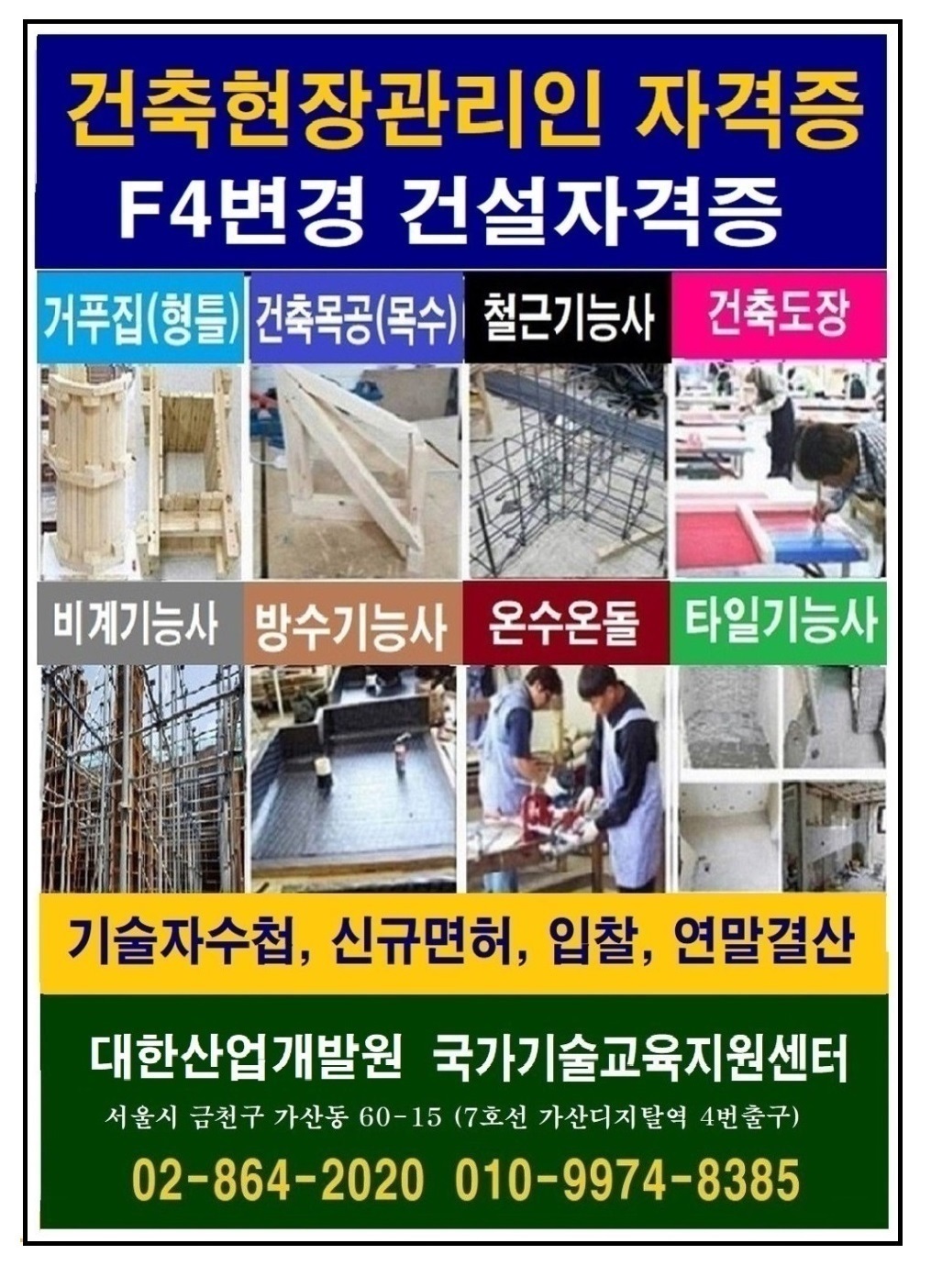 필기시험이 없고, 하루 실기교육으로 쉽게 취득할 수 있습니다. (거푸집, 방수, 비계, 건축목공, 타일, 건축도장, 온수온돌, 금속재창호, 철근 )