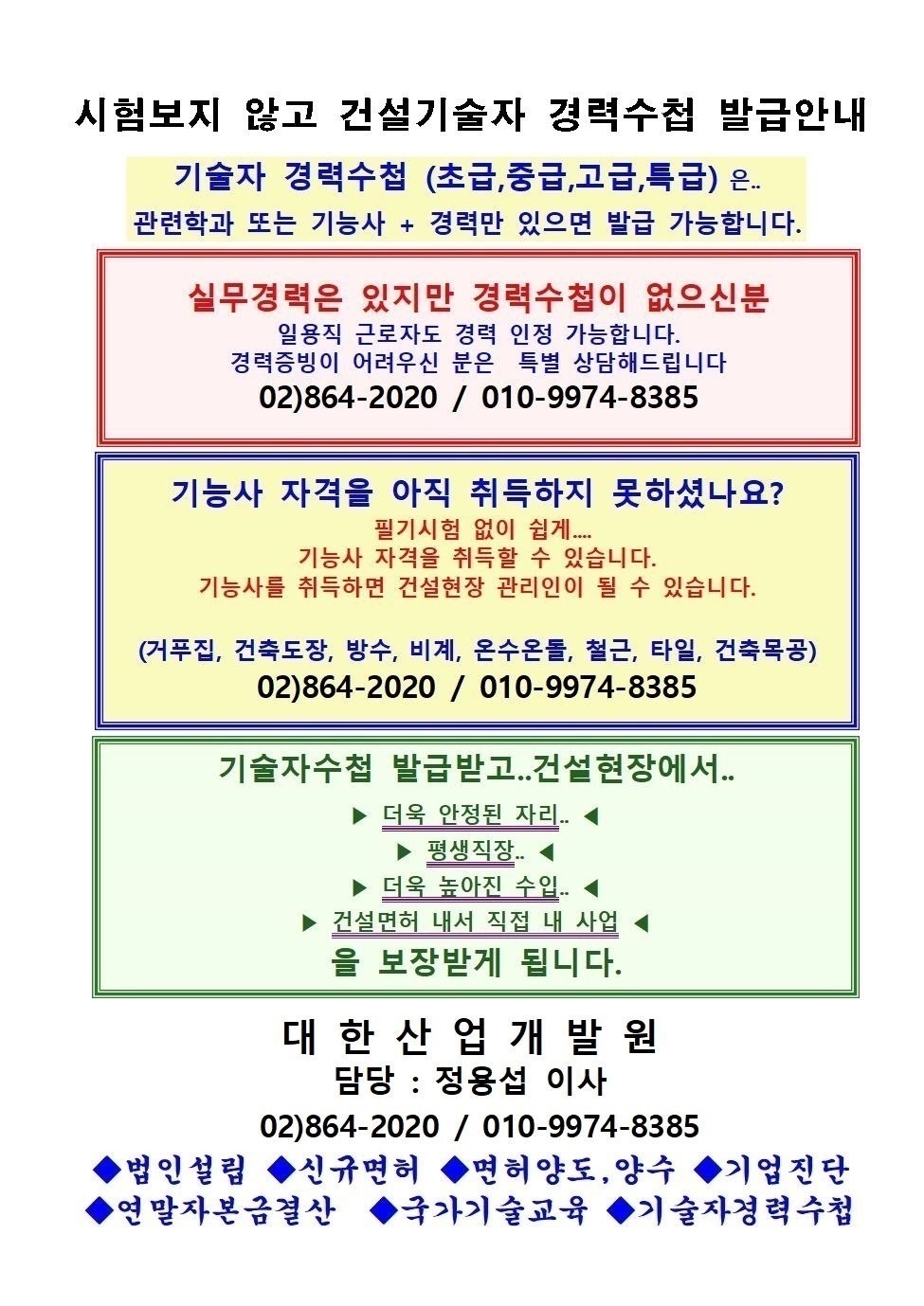 시험보지 않고 건설기술자 경력수첩 발급안내 (초급,중급,고급,특급) ~대한산업개발원