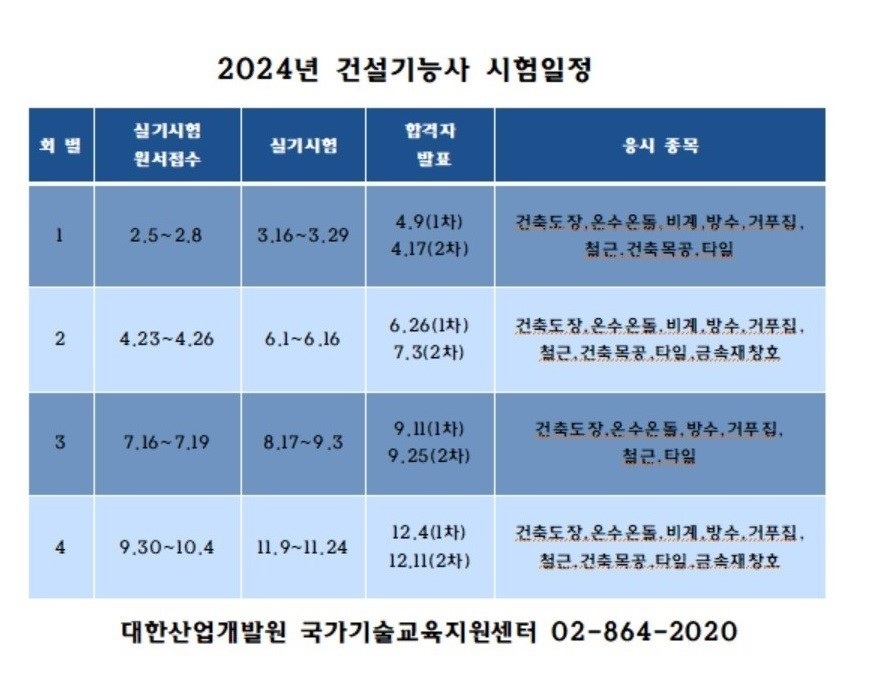 건축목공기능사, 비계기능사, 건축도장기능사, 온수온돌기능사,