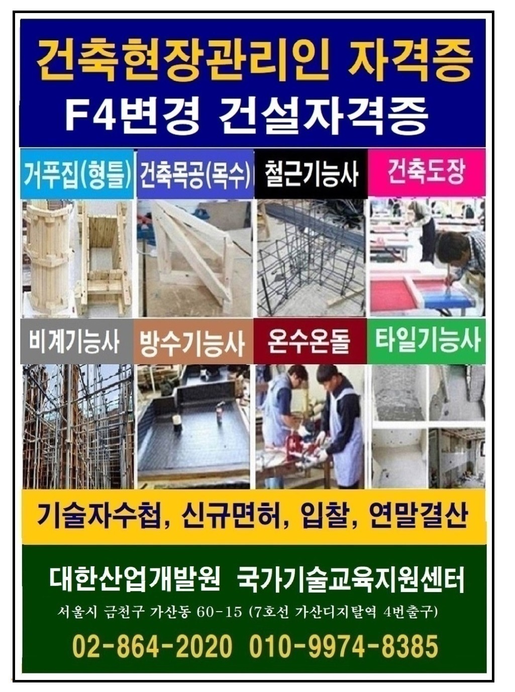 타일기능사, 방수기능사, 철근기능사, 거푸집기능사,
