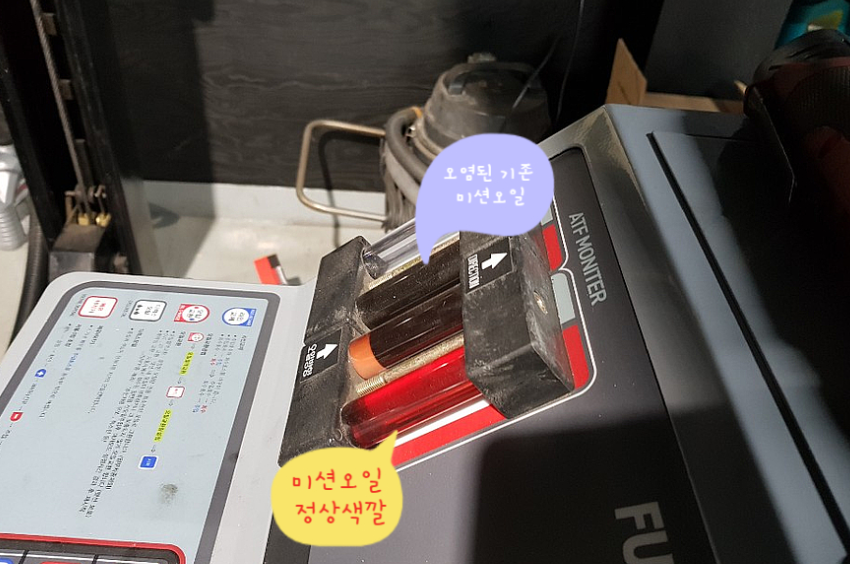 정상적인 오토 미션오일 색은 맑은 적홍색이지만, 오토미션오일 교체시기가 지났을 경우에는 진한 갈색을 띠게 되며 다량의 쇳가루가 함유되어 있습니다. 따라서 오일이 부족하거나 오일 점성이 떨어질 경우 변속시에 쿵하는 소리가 나거나 둔탁한 변속충격이 나타나게 됩니다.