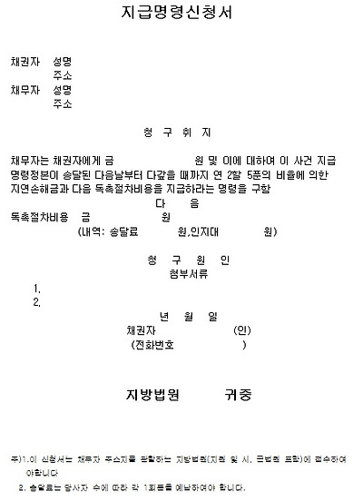 채무자는 법원에 지급 명령을 신청하고자 작성하는 문서를 지급명령 신청서라고 한다. 지급 명령 신청을 통해 판결이 내려진 경우 채무자는 명령을 이행하여야 하며 만일 이의를 제기할 경우 지급명령서를 송달받은 일로 14일 이내에 지급명령 이의신청서를 작성하여 법원에 제출하여야 한다.