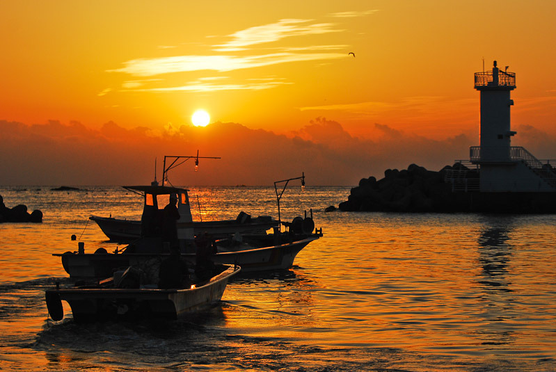 아침 햇살 퍼지는 알사탕 숲으로 방파제 거닐며
