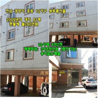 [ 물건요약보고서] 소재지: 전라남도 광양시 중동 1371-1 새롬빌 면적: 대지 61평 / 연면적 115평 1층필로티 4층건물 건축물: 주용도 단독주택 2009년 5월 건축물사용승인 임대현황: 원룸 6개, 투룸6개 [풀옵션 원룸.투룸] 현임대현황: 원.투룸 보증금 100만원- 월26만원임대중 임대보증금현황 : 원.투룸 보증금 각100만원* 12호실 = 총 1200만원 수익성: 월세총 312만원 (보증금 각호실마다 100만원) 교환시: kb아파트 시세 4억2천만원의 서울아파트 매물과 교환 매물특징: 융자없는 수익형풀옵션원룸건물로서 안정된 임대와 수익률이 특징 연락처: 010-8030-8566 중간의견조율후 통화를 희망합니다. 사전문자나 의견조율희망합니다. |