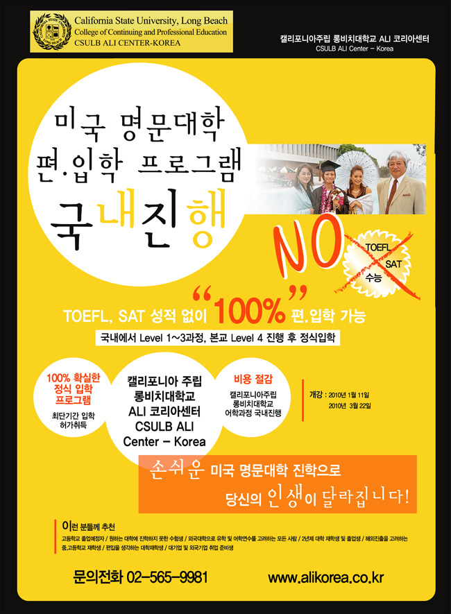 한국에서 토플을 공부하느라 별도의 시간과 노력을 들일 필요가 없습니다. 또한 토플 성적이 나온 후에도 미국 대학으로 지원하고 입학을 기다리는데 보통 3~6개월 정도가 걸리게 되는데, 조건부 입학 허가를 받게 되면 이러한 불필요한 시간 낭비도 막을 수 있다. | ||||||