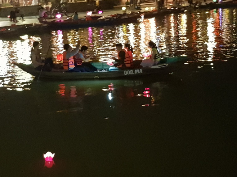 ▲호이안 투본강에 소원등을 띄우는 사람들