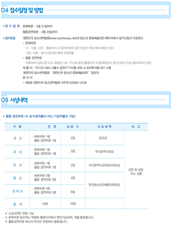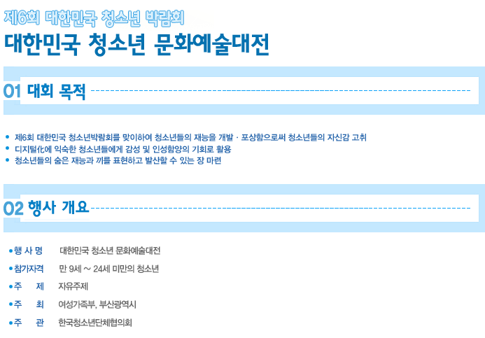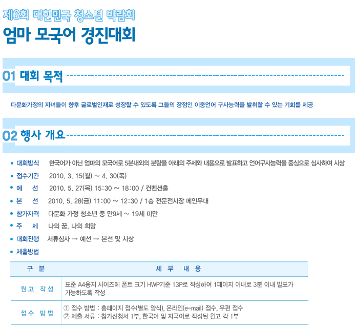 우선, 청소년 여러분들이 정말 즐겁고 유익하게 즐기실 수 있는 박람회가 부산 BEXCO에서 2010년 5월 27(목)부터 30(일)까지 4일간 열립니다. 문화예술대전, 청소년 모의 국제회의, 금융경제 교육 등 다양한 행사가 준비되어있으니 꼭 참여하셔서 여러분들의 숨은끼와 재능을 마음껏 펼쳐주세요.(www.youthexpo.net)