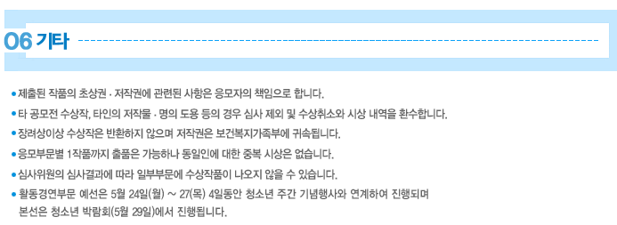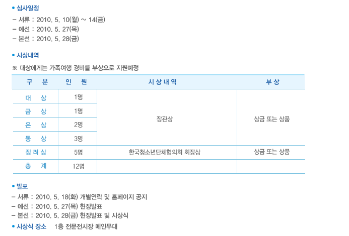 그리고 2010년 5월 24(월)부터 27(목)까지 4일간 2010 대한민국 청소년 주간 기념행사가 열립니다. 걷기대회, 문화행사 등의 프로그램이 있으니 많이 참여해주세요(www.youthweek.kr)