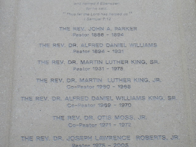 마틴 루터 킹 목사가 재직했던 년도 1960 - 1968 년이 교회 입구벽에 대리석으로 새겨져 있다